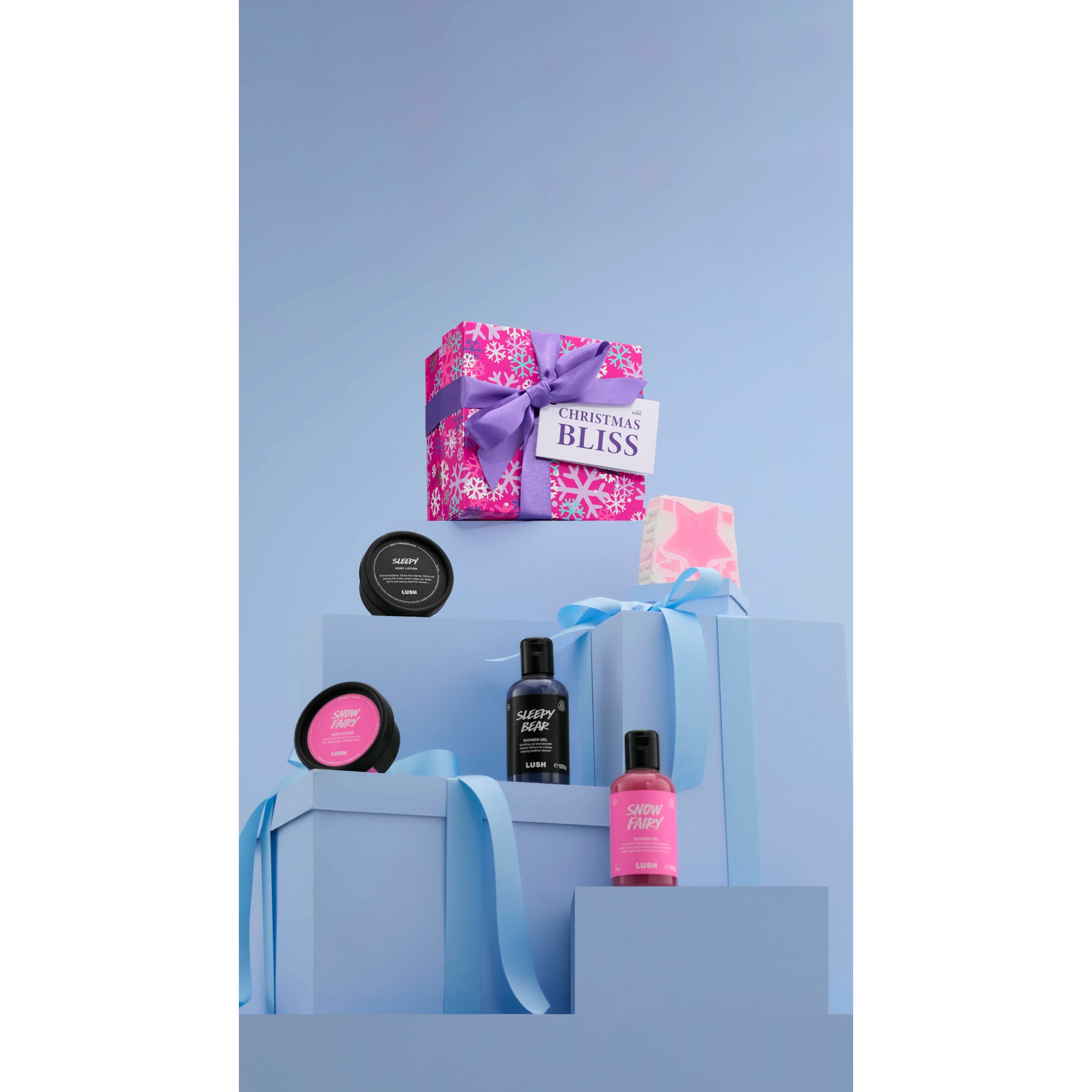 Wrapped inside this gift, find sweet bliss that will sweep you off your feet and to a land of pure delight. Start your relaxing routine in the shower or bath, with sweet Snow Fairy or soothing Sleepy Bear. Keep your calm outside the waters with some Sleepy body lotion to wrap yourself in a blanket of lavender and tonka.