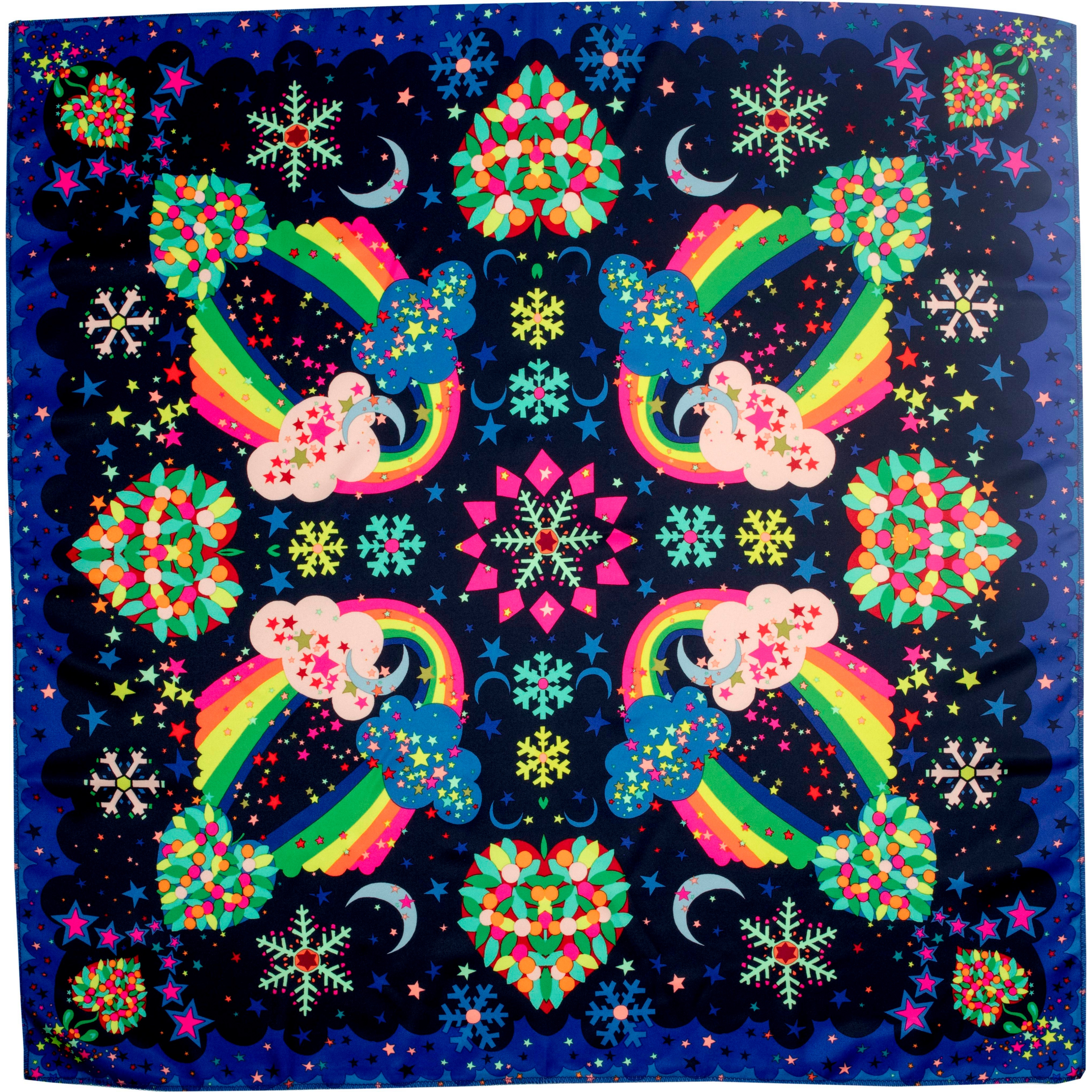 This Knot Wrap is 100% Recycled Polyester made from recycled plastic bottles. The bottles are collected to GRS (Global Recycled Standard) and are washed, spun and chipped. These chips are melted and go through a fine spinneret, which extrudes the plastic into yarn. The fabric is then printed using heat transfer method, which can achieve lots of detail and painterly effects, the process also uses less water than rotary printing. Once printed, it is sewn and finished in Anhui Province China. Pass Forward, Re-Use for a LUSH environment.