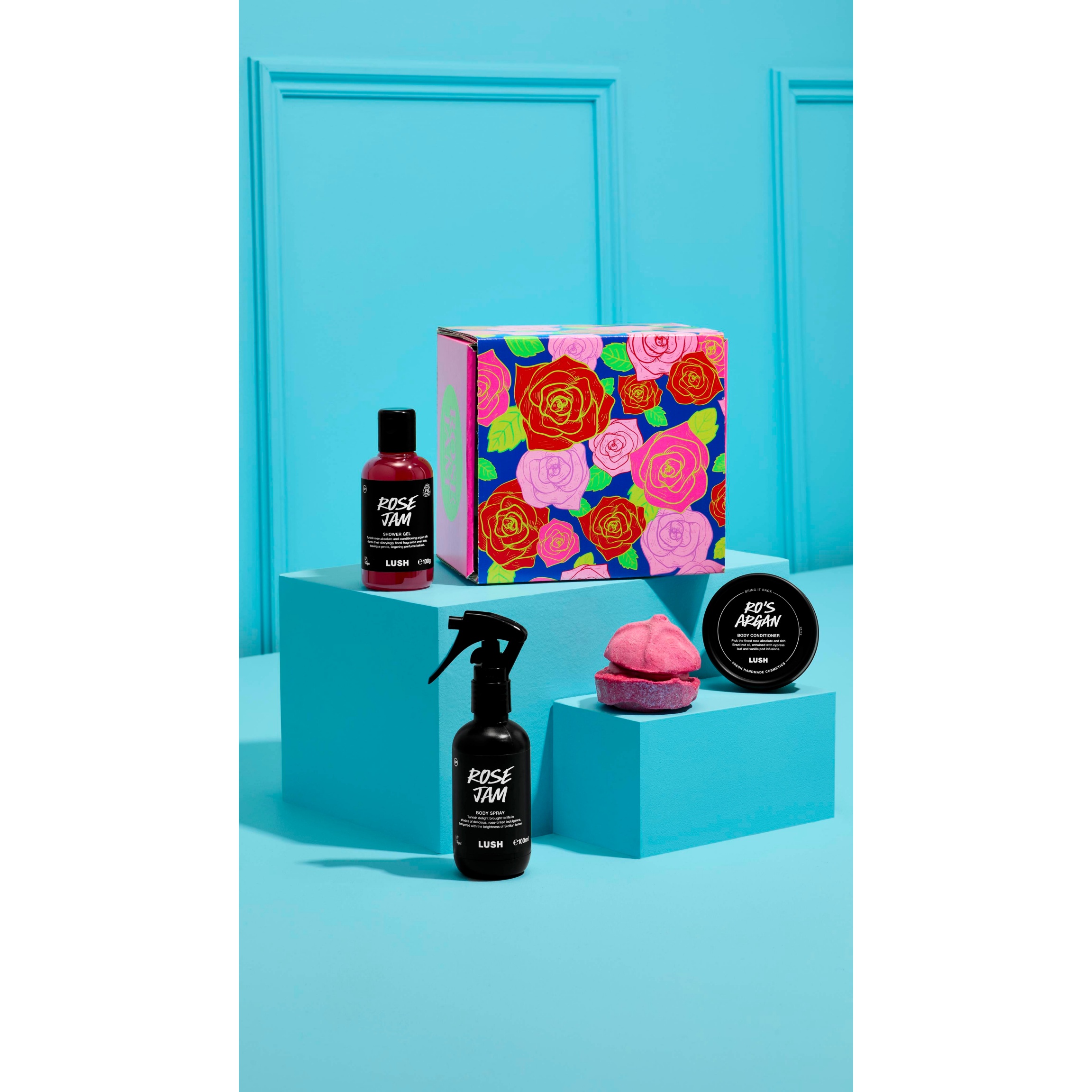 Lush Designer Loren Harrison says, “Rose Jam is one of my favourite Lush scents, and the fun rose pattern and jammy colours match the contents of this gift!”